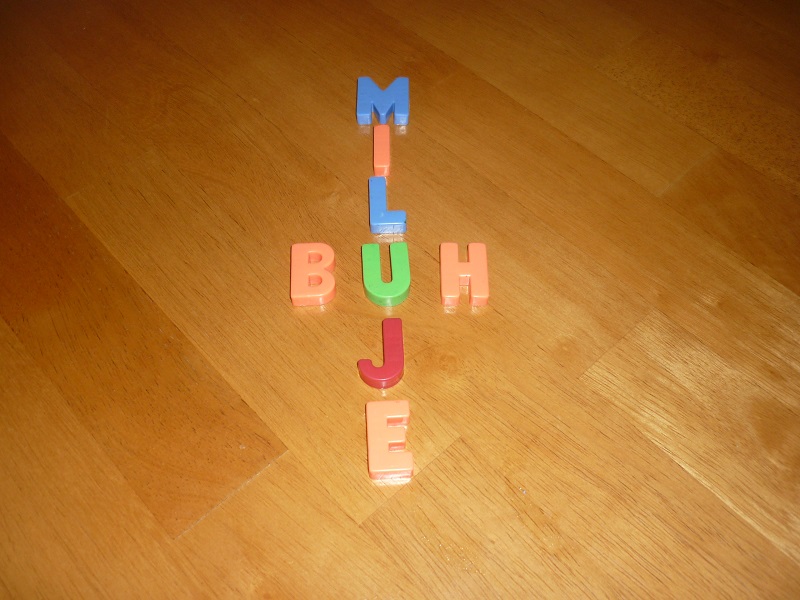 Dnes ráno jsem přemýšlel, co jim zase připravím :-) a tak mě napadlo udělat nápis z písmenek. Původně jsem zamýšlel vytvořit nápis „Bůh tě miluje“. Jak ho zrealizovat? Vzpomněl jsem si na dětskou magnetickou tabuli, kterou Sárinka dostala k narozeninám. Tam jsou magnetická písmenka, bez háčků a bez čárek, každé písmenko v abecedě právě jednou.